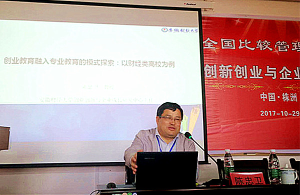 会上,陈忠卫作了题为“创业教育融入专业教育的模式探索:以财经类高校为例”的主题报告。他认为,在以“互联网+”、人工智能、机器人为推动力的新一轮工业革命与经济转型背景下,创业者将更多地面临奈特型不确定决策而非常规性的风险型决策问题,高校创业教育必须从效果推理而非一味地坚持因果推理出发,全面更新所传授的经济管理类知识。陈忠卫还介绍了我校以大学生创业案例与创新创业教育研讨会为平台,以入住学校创业孵化基地创业为研究对象,积极探索本科生创业实践、研究生撰写创业案例、创业导师辅导“三位一体”的高校创新创业教育模式的具体做法。